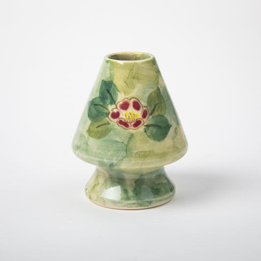 Complementing the matcha bowl, we admired a beautifully crafted tea whisk stand. Taniguchi-san, who trained under the prestigious Urasenkei school of tea ceremony, brings exceptional expertise to each piece. This elegant stand not only enhances your tea setup but also cradles your chasen (bamboo whisk) securely and gracefully. Like the mug, it’s adorned with a delicate camellia motif.