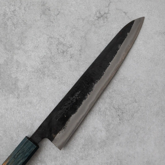 This exceptional Ishizuchi Blue Super Steel Kurohada Tsuchime Petty Knife not only boasts a visually striking black textured surface created using the Tsuchime technique but also offers outstanding functionality. Crafted from the finest Aogami Blue Super Steel, it guarantees durability and precision.