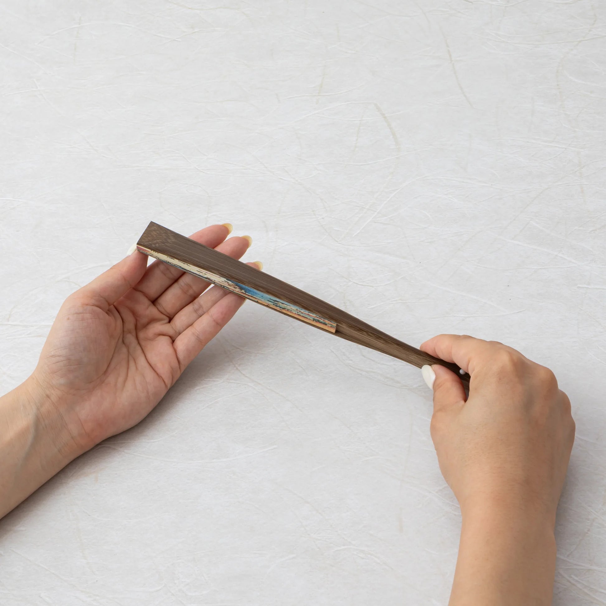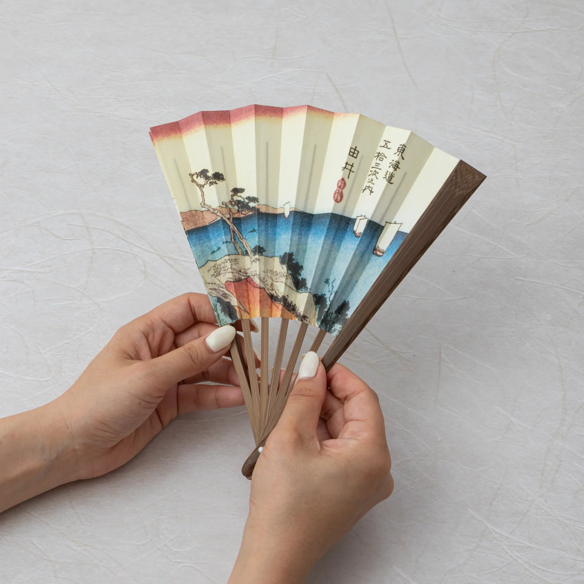 Expertly crafted with bamboo ribs, this fan offers both durability and elegance. It comes with a display stand, allowing you to showcase this beautiful piece of Japanese artistry when not in use. Whether as a functional accessory or a decorative element, this folding fan is a captivating homage to Hiroshige's mastery of ukiyo-e and Japan's scenic landscapes.