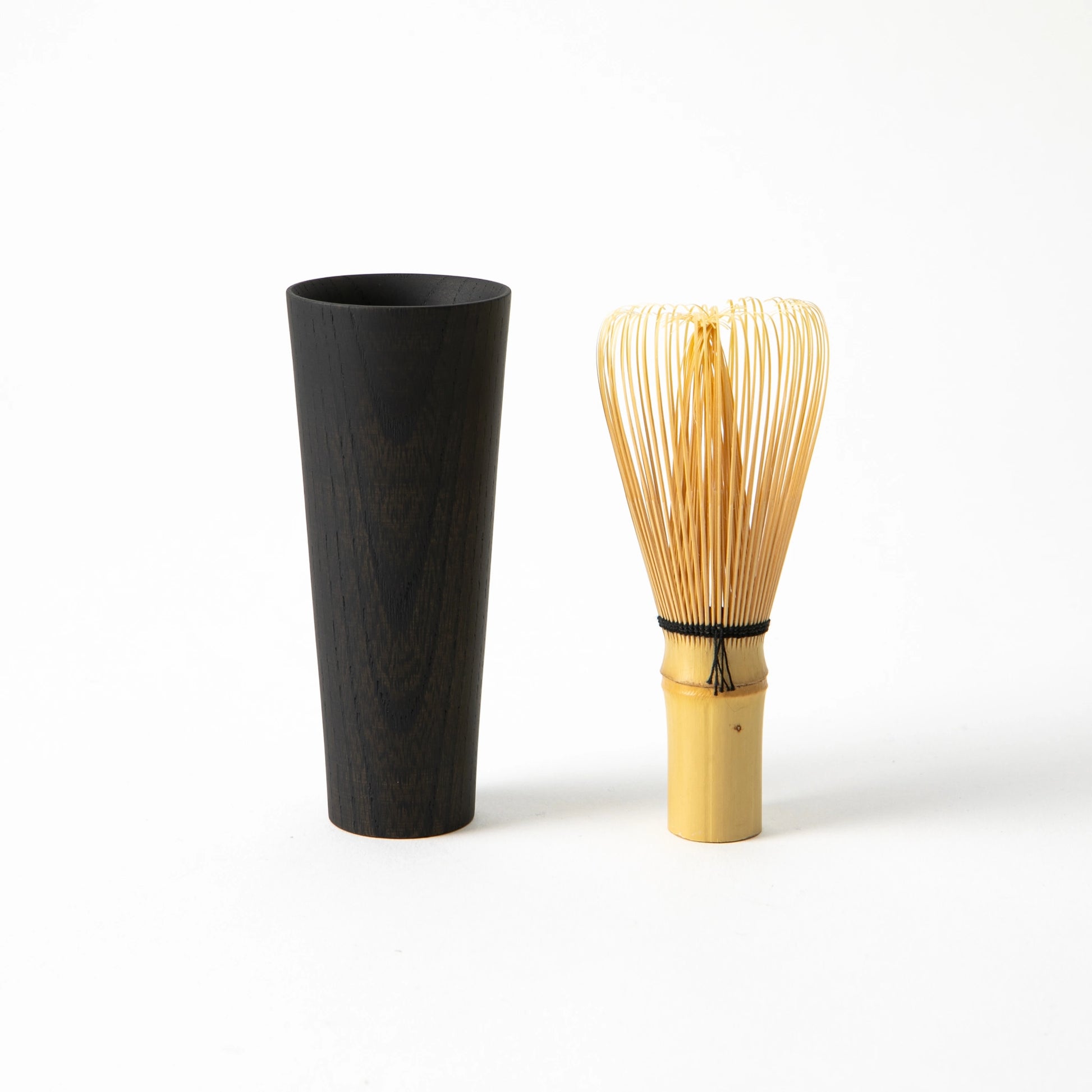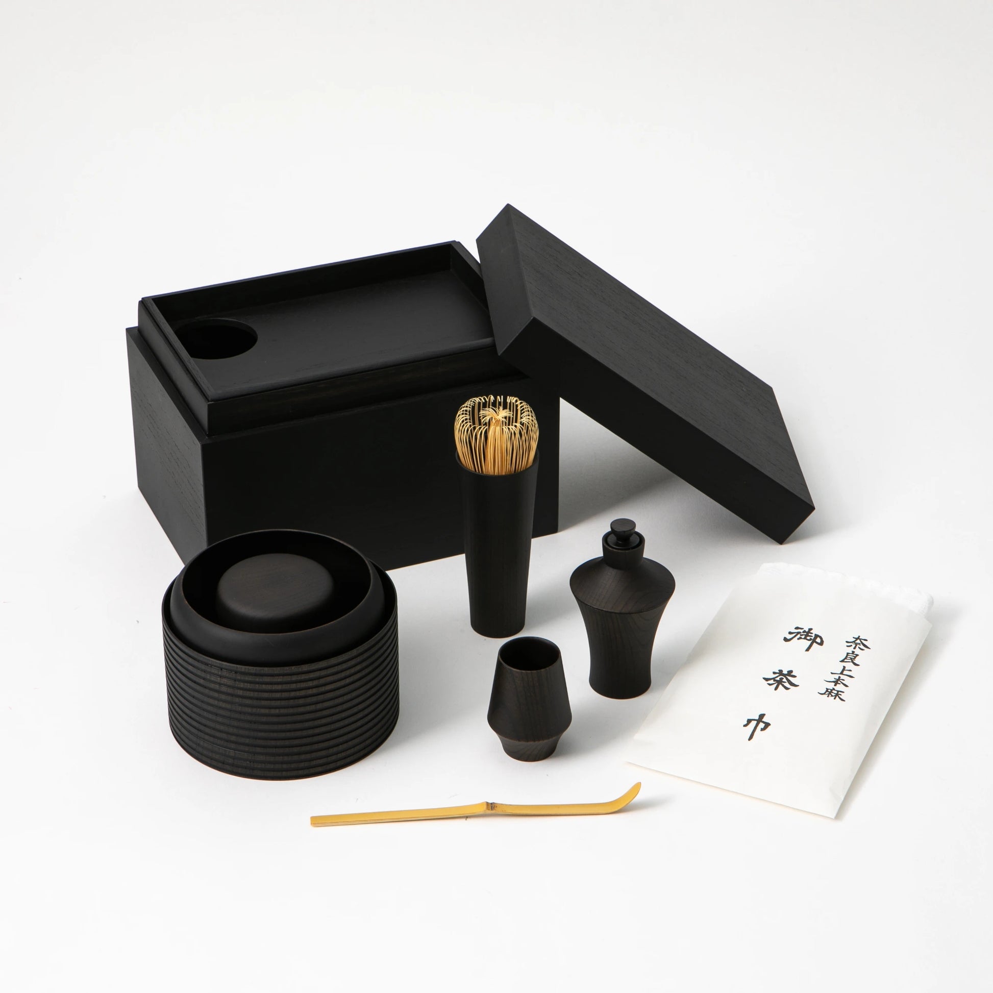 Inside the box, a matcha container, tea whisk case, tea cloth case, infuser, tea bowl, and slop bowl are all formed from zelkova, unified by proportion and tone rather than repetition. Bamboo tea whisk and tea scoop complete the set, introducing a natural contrast in texture while preserving harmony. Every piece has a precise role, yet none feels isolated. Together, they establish a rhythm that supports the act of making tea with calm clarity.