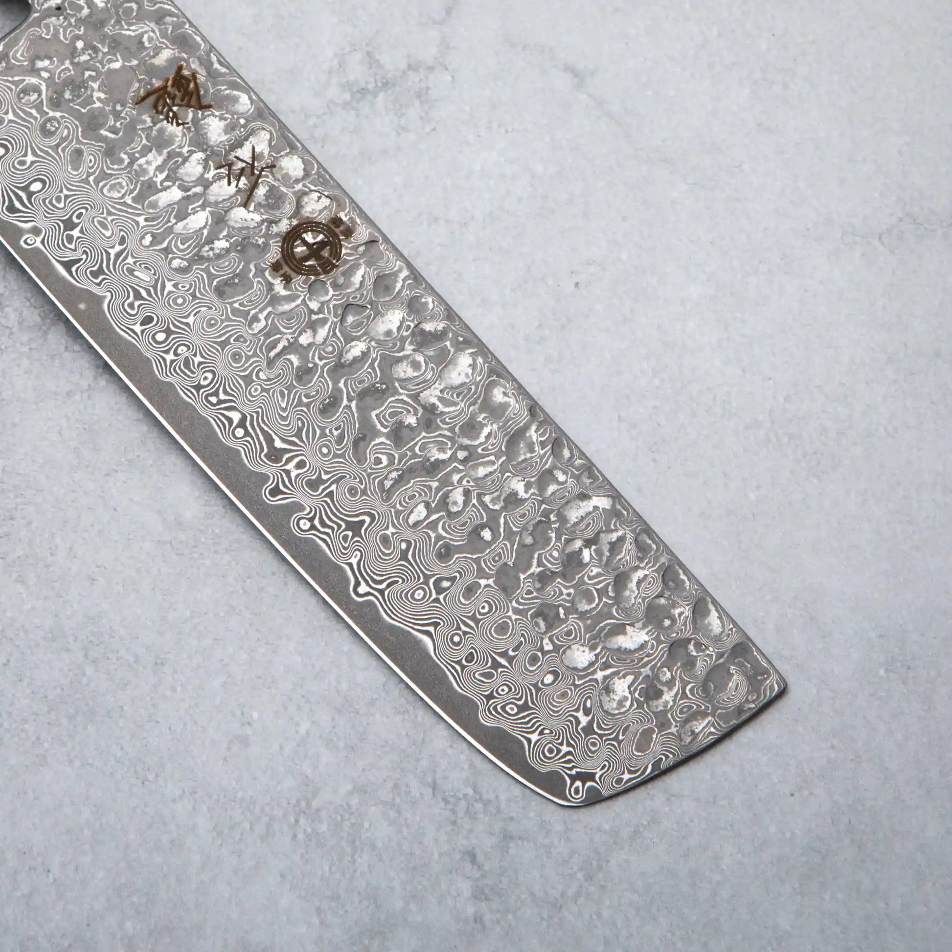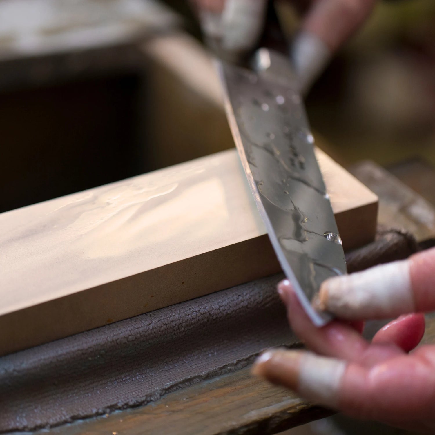The Ishizuchi VG10 Damascus Tsuchime Nakiri Knife and Japanese Whetstone Set is an Omakase-exclusive ensemble that unites two disciplines of Japanese mastery—cutting and sharpening. The 67-layer VG-10 Damascus Nakiri by Ishizuchi Knives is meticulously forged for vegetable preparation, offering clean, effortless cuts with every motion. Its hammered tsuchime surface and maddo shiage (mud finishing) reveal an elegant Damascus pattern of remarkable depth and luminosity. Accompanied by the Shoma Ceramic Iyo Whetstone by Iyo Kogyosho, crafted through years of development to capture the smooth, responsive feel of natural Iyo stone, this set delivers professional-level sharpness and refinement. Presented in a distinguished box, it is available exclusively through Omakase—a thoughtful gift and essential companion for those who appreciate the quiet artistry of Japanese steel.
