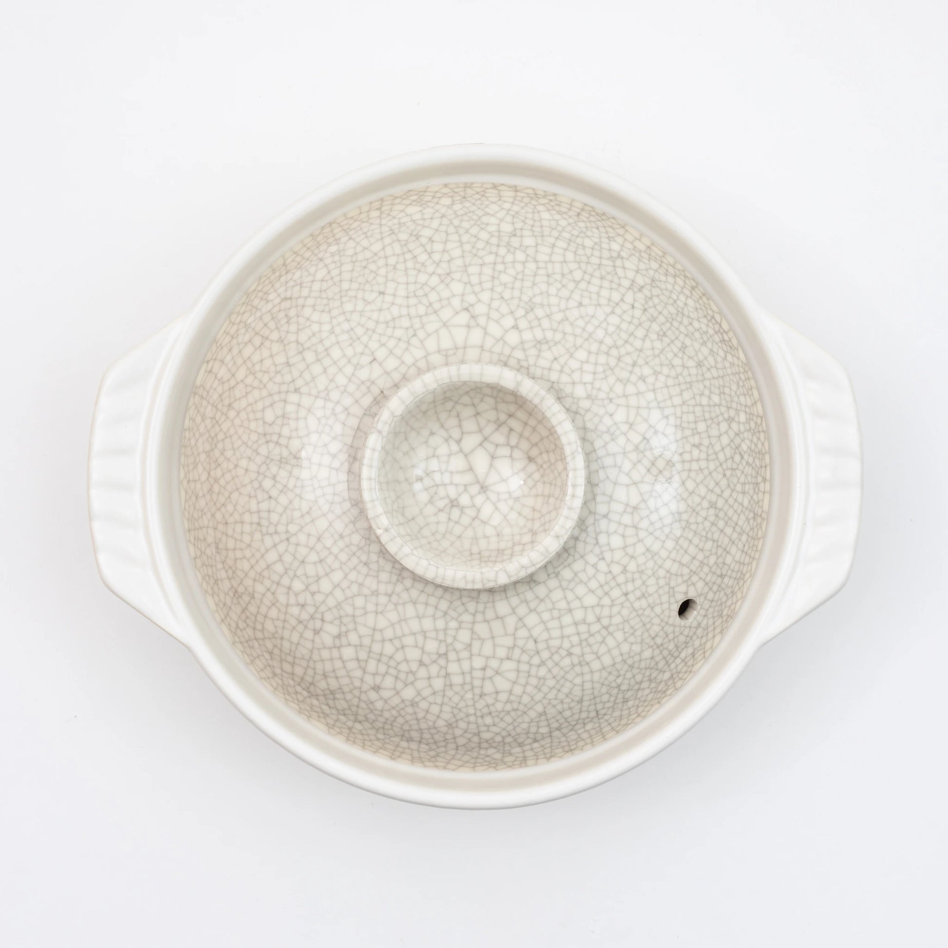The Kannyu White Donabe Clay Pot by Sajitouki blends quiet refinement with everyday function. Its soft ivory hue and intricate crackled glaze, known as kannyu, lend a timeless presence to the table, each pattern forming naturally during firing. Crafted by hand in Japan, the pot’s thick clay body retains heat evenly, creating a gentle simmer ideal for sharing hot pot meals with family or friends. Designed for 3–4 people, it embodies the balance of beauty and practicality that defines Sajitouki’s work. Each donabe is a celebration of clay’s living nature—subtle, imperfect, and deeply expressive—turning every meal into an experience rooted in warmth and tradition.
