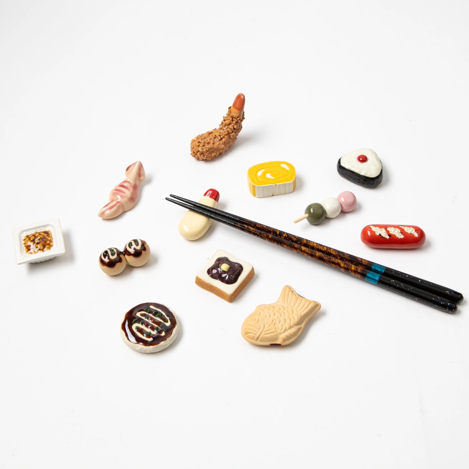 This set includes twelve distinct chopstick rests, each representing a unique Japanese motif: