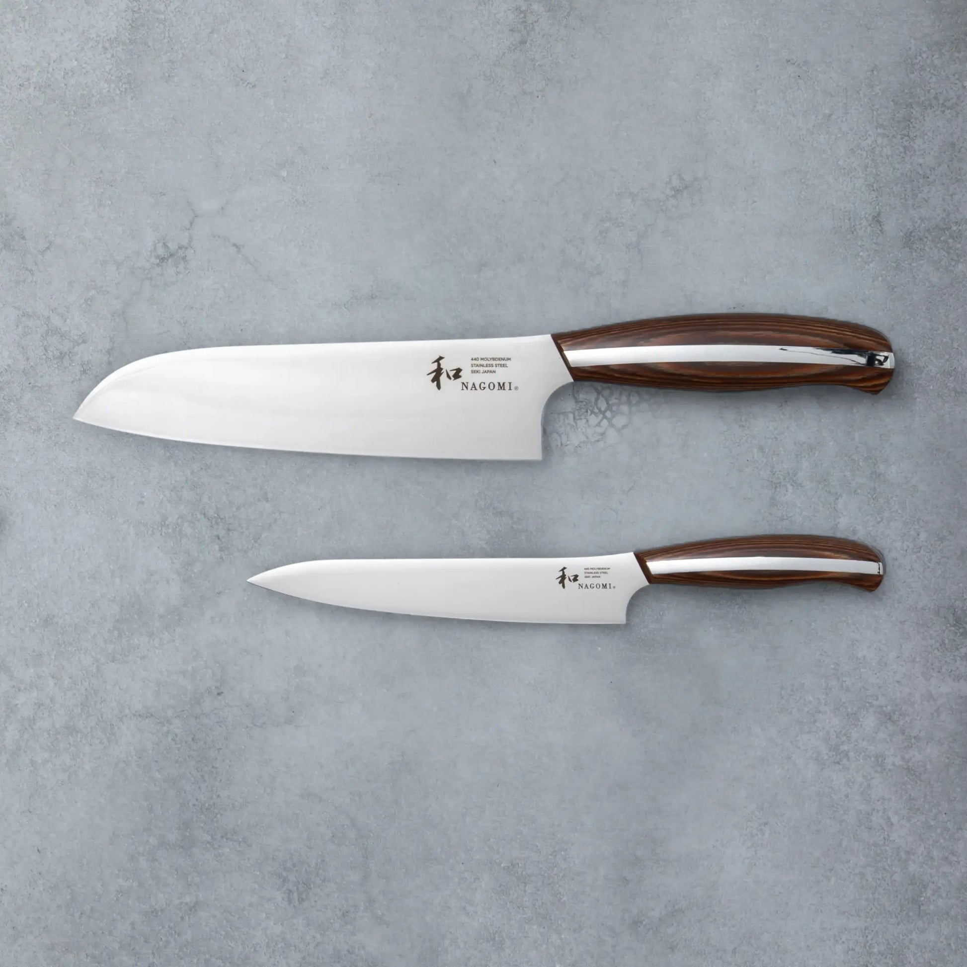 The NAGOMI Santoku and Utility Knife Set by Mitsuboshi Cutlery brings together precision, comfort, and beauty in perfect harmony. Each knife is handcrafted in Seki, Japan’s historic blade-making capital, where centuries of craftsmanship meet modern refinement. The Santoku knife offers exceptional sharpness and balance, with a seamless handle that feels natural in hand for effortless control. The smaller utility knife complements it perfectly—ideal for peeling, trimming, and precise work that requires agility. Together, they form an elegant pairing suited for both seasoned cooks and those beginning their culinary journey. Presented in a sleek gift box, this set embodies the essence of Japanese craftsmanship—functional, timeless, and made to be cherished.