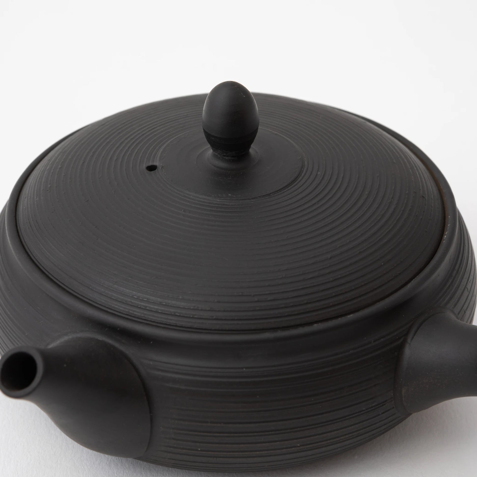 The Tokoname Gyokko Kokuyohen Streak Teapot embodies the quiet elegance of Japanese tea culture, crafted with the refined artistry for which Tokoname ware is renowned. Its deep black finish, achieved through the kokuyohen firing technique, reveals subtle streaks across the surface, a visual texture that enhances its understated presence. The flat, wide body allows tea leaves to unfurl gracefully, ensuring a smooth and balanced extraction, while the side handle offers a natural, effortless pour. Handcrafted by Gyokko, one of Tokoname’s esteemed artisans, this teapot is both a functional vessel and a work of quiet beauty. Ideal for sencha and gyokuro, it reflects the harmony of tradition, precision, and simplicity that defines Japanese teaware at its finest.